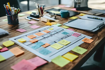 A lively workspace with colorful sticky notes and a project planner on a wooden table