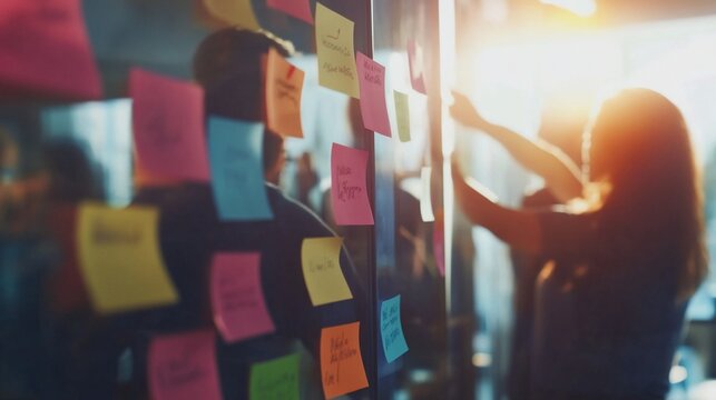 Teamwork in action: Brainstorming ideas on a glass wall full of sticky notes