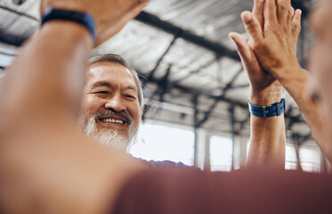 Senior men, gym and high five for fitness, teamwork motivation and diversity with friends happiness. Elderly training partnership, asian and black man for mma workout, exercise and team building goal