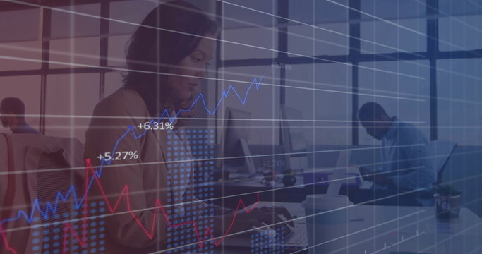 Typing woman wearing blazer working on laptop in open-plan office, with financial graphs overlay
