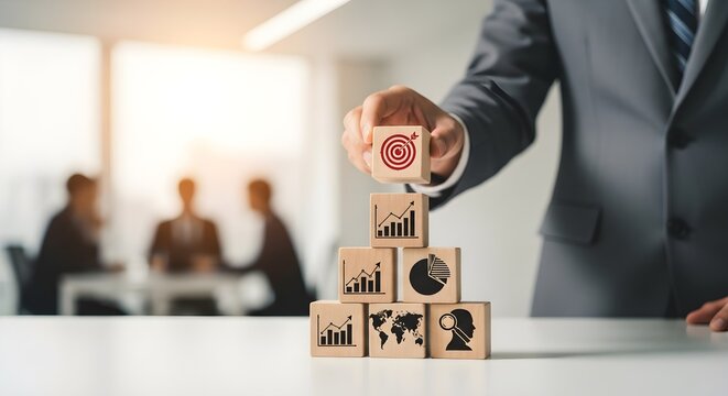 Business Strategy Achieving Goals with a Pyramid of Wooden Blocks Depicting Charts