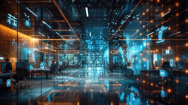 Team collaborating in modern office with data encryption overlay