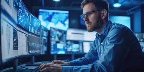 Focused professional working at multiple computer screens in a modern tech environment