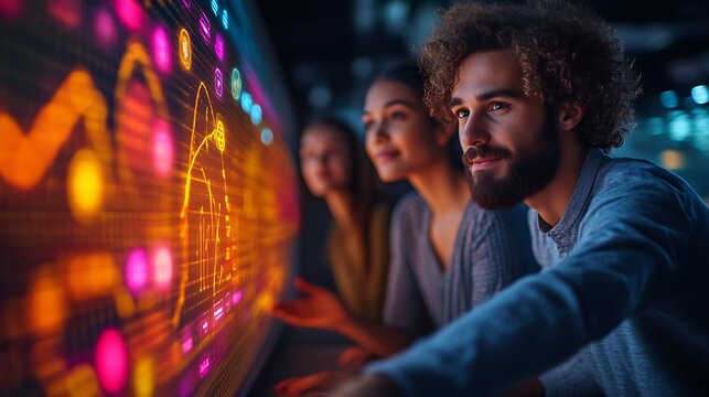 Team analyzes futuristic data displays. Tech experts review marketing insight. Mapping customer journeys. Planning brand strategies. Modern tech dashboard with graphs. Team collaborates in office