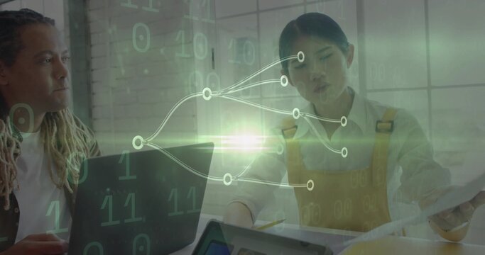 Business meeting with network connection overlay illustrating collaboration and innovative ideas across diverse teams in professional settings