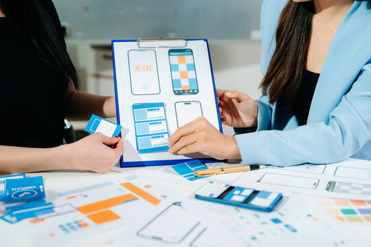 UX developer and ui designer brainstorming about mobile app interface wireframe design with customer breif and color code