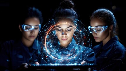 group of three focused scientists engages with futuristic technology in a dimly lit lab. central figure analyzes glowing holographic data, showcasing collaboration and innovation