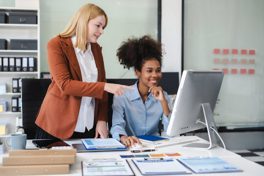 Diverse associates team in a modern office collaborates on project planning, using charts and analytics to drive performance and success while fostering work alliance and synergy.