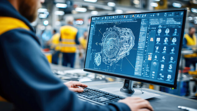 Engineer Working on a Computer with Technical Drawings in a Modern Manufacturing Facility