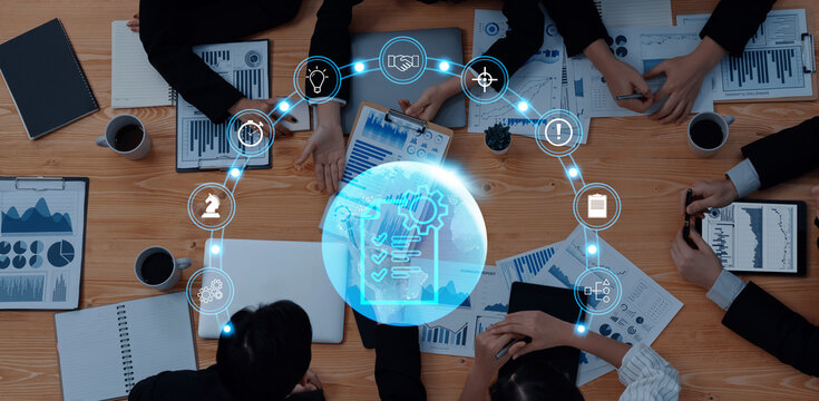 A top view image of people collaborating on project planning and data analysis in a modern office setting, showcasing teamwork and technology integration in business strategy. Gantry