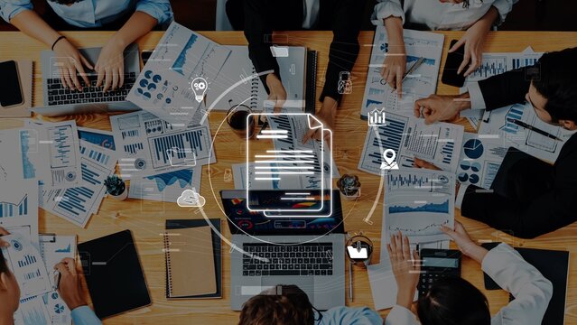 A business team collaborates over data analysis, showcasing charts and graphs in a modern workspace, enhancing productivity and strategic planning. Trope