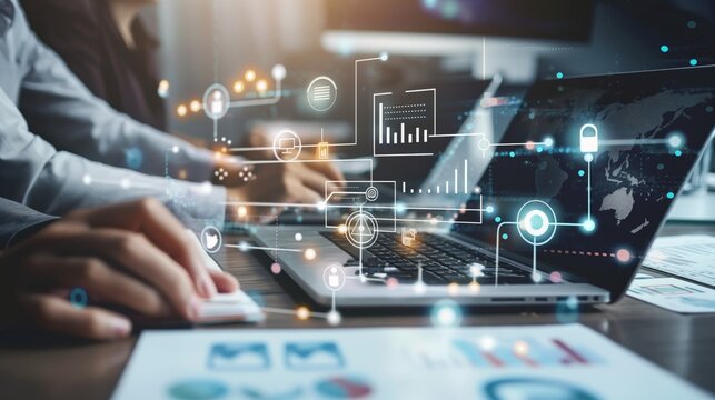 Analyzing business performance through data visualization on a laptop in a modern workspace