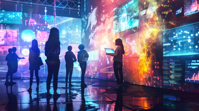 People are silhouetted against a backdrop of brightly colored data screens in a futuristic setting