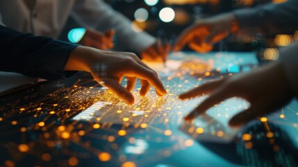 Team collaboration in innovative technology environment with hands interacting on digital touch screen interface displaying data and patterns.