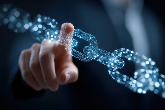 Business professional interacts with digital blockchain network illustration in modern office setting during a daytime meeting