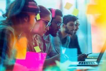 Team collaborating on project using sticky notes and laptops in modern office. Engaged in brainstorming and planning, diverse team working together to achieve goals.