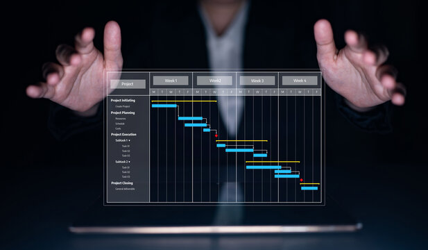 A businessman presents a digital Gantt chart for project management, showcasing task timelines and progress in a modern and innovative business environment. Tessel