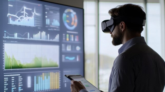 Engineer Analyzing Digital Models of Renewable Energy Solutions with Virtual Elements and Technology in Bright Environment