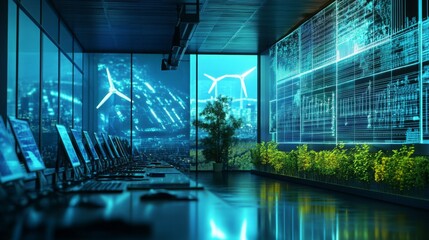 In a high-tech office with large windows, a team is engaged in analyzing data related to sustainable finance.
