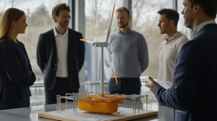 Engineer presenting a floating wind turbine model to a team, meeting room setting, technical discussion on offshore wind, ideal for stock use,