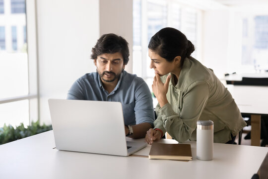 Two Indian teammates analyze data, working on joint project using modern laptop, look at spreadsheets, reports, or analytics, making decisions, solve work-related matters, generate business strategy