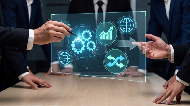 A diverse team of professionals collaborates around a glowing digital interface analyzing data and planning future strategies in a modern office