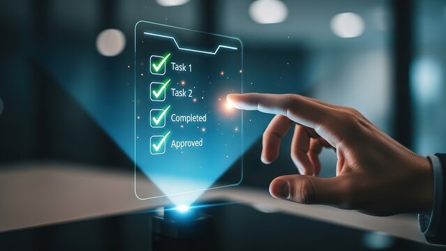 A hand interacting with a futuristic digital interface with checklist tasks in a modern office setting