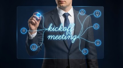 Businessman's hand drawing a glowing digital interface displaying 'kickoff meeting' with connected team member icons on a dark blue gradient collaboration strategy planning corporate