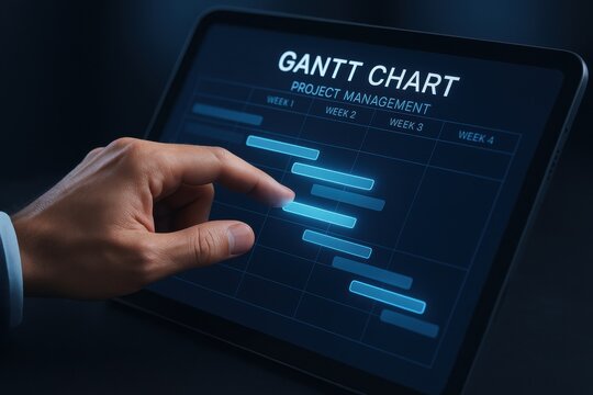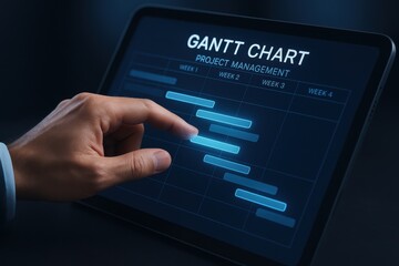 Hand interacting with a digital Gantt chart on a tablet, illustrating project management timelines and task organization. Concept of workflow optimization and efficiency in business.