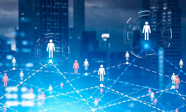 Abstract human icons linked by lines on blue-toned city background, modern graphic style, representing digital communication and networking concept