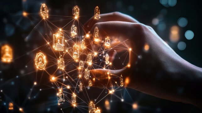 Hands typing on laptop with people network icons overlay, symbolizing digital recruitment, HR analytics, remote hiring, online collaboration, and modern workforce management.
