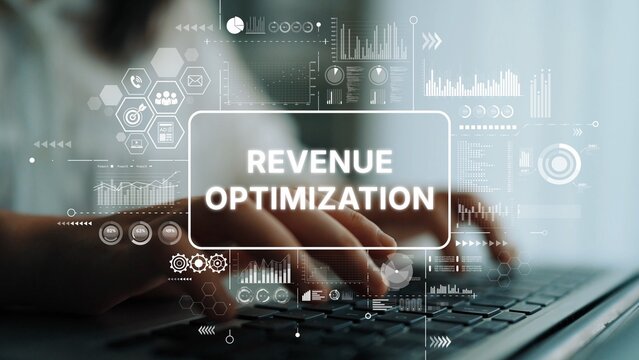 Hands Typing on Keyboard with Revenue Optimization Graphics and Digital Data Overlays in Office Environment. Asymptotic smart data analytic.