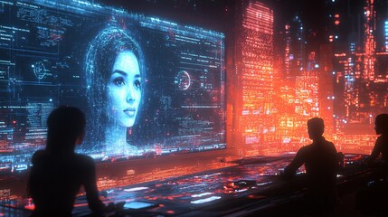 Diverse team collaborating with futuristic data interface