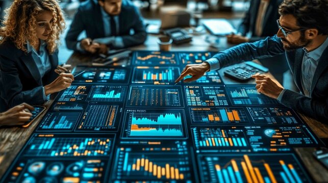 Innovative business meeting with digital financial analysis overlay