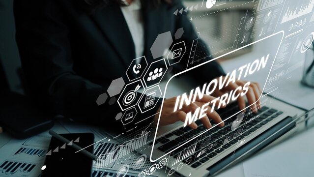 Business professional analyzing innovation metrics on a laptop with graphic elements for data visualization and analytics. Asymptotic smart data analytic.