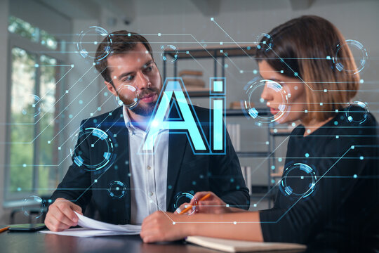Business professionals discussing AI technology with futuristic digital interface overlay.