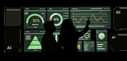 AI Using. Silhouetted analysts interact with a large AI data. AI Display charts graphs and analytics. Business team using futuristic AI interface visuals data. Technology with biz insights and ai data