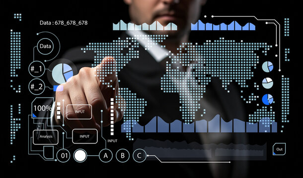 Business professional interacting with futuristic data analysis interface showcasing global analytics and digital metrics on touchscreen technology