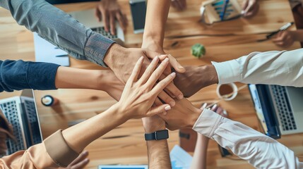 Hands joining, team unity, business meeting, focus on, collective strength, dynamic, composite, conference room backdrop