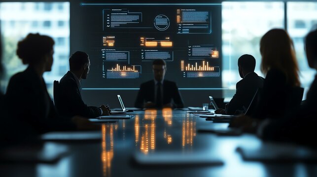 A diverse group of professionals engages in a dynamic presentation with data visualizations in a modern office setting