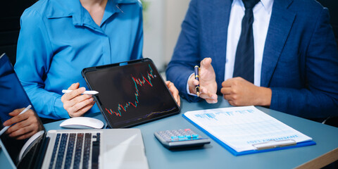 Professional business team analyzing stock market chart on tablet in modern office, discussing growth, finance, and investment strategy.