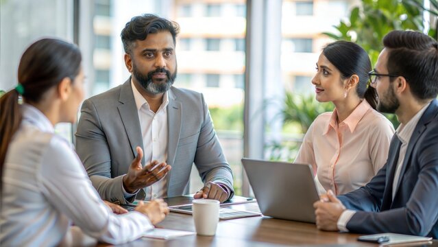 "Experienced Indian HR Manager in Office Meeting" - An Indian HR manager leading a team meeting in a modern office.