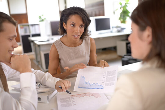 Business people meeting, stats paperwork and woman show accounting graph, financial trade metrics or economy insight. Teamwork, professional group and staff cooperation on customer experience chart