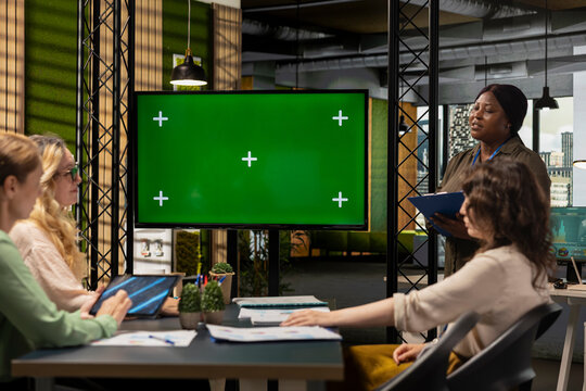 Team of goals oriented managers work with a chroma key on TV monitor in a modern boardroom, hosting a business discussion with monthly reports insight. Company strategy for growth.