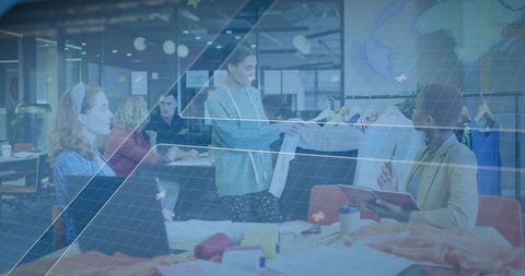 Creative team presenting fashion samples with ar data overlay during design review