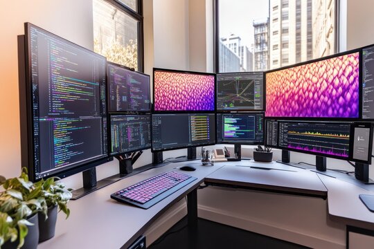 Home office with multiple monitors supports coding and data analytics, enhancing focus and efficiency