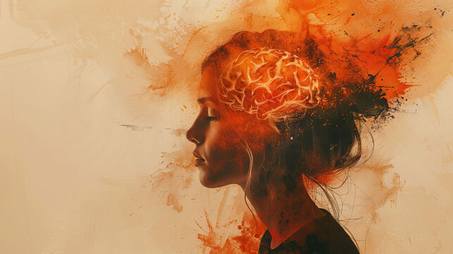 International Parkinson's awareness month concept, a girl silhouette with degenerative disease logo, Mental health. Stroke, synapses and neurons interaction art, Poster, banner, card, background.