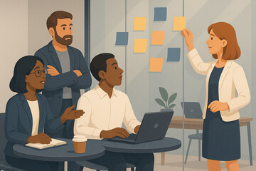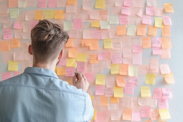 Young man brainstorming ideas in front of a wall covered with colorful sticky notes. Creative planning and team workflow concept for office, design thinking, or project management visuals..