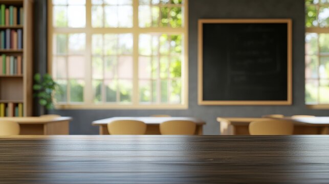 A bright classroom interior featuring wooden tables, chairs, and large windows with a chalkboard backdrop.