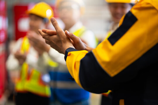 Clapping. Unity and teamwork concept. Professional diverse team standing hands together. Professional Mechanical Engineer team Working at metal sheet profiling factory. Industrial production